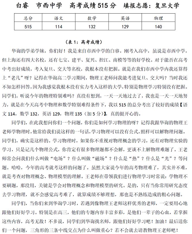 白睿市西中學高考成績515分填報志愿:復旦大學