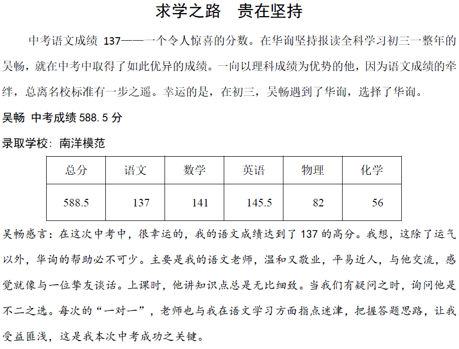 吳暢中考成績588.5分錄取學校: 南洋模范